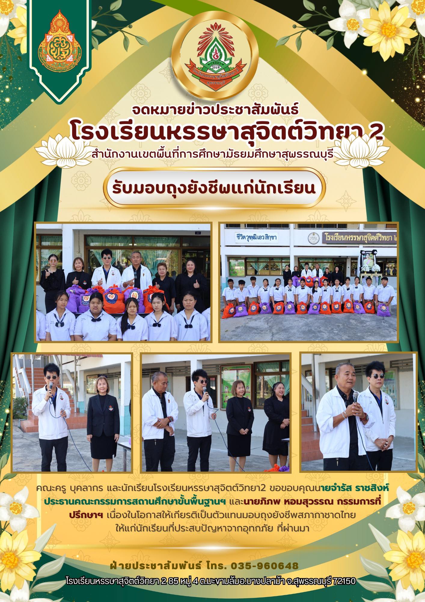 ขอขอบคุณนายจำรัส ราชสิงห์ ประธานคณะกรรมการสถานศึกษาขั้นพื้นฐานฯ และนายภิภพ หอมสุพรรณ กรรมการที่ปรึกษาฯ เนื่องในโอกาสให้เกียรติเป็นตัวแทนมอบถุงยังชีพสภากาชาดไทยให้แก่นักเรียนที่ประสบปัญหาจากอุทกภัย